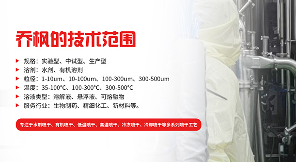 上海喬楓實業有限公司,成立于2012年,是從事噴霧干燥設備的研發設計、生產、銷售(小型噴霧干燥機,實驗型噴霧干燥機,35℃低溫噴霧干燥機,有機溶劑噴霧干燥機低溫閉式循環噴霧干燥機、超細粉末噴霧干燥機、噴霧冷凍干燥機、真空噴霧干燥機、氣流噴霧干燥機,噴霧造粒干燥機,離心噴霧干燥機沸騰制粒機等)和售后于一體的綜合性公司,本公司現成為一家致力于為生物制藥、精細化工、新能源、陶瓷造粒及食品工程等領域提供全套解決方案的整線交鑰匙工程企業。